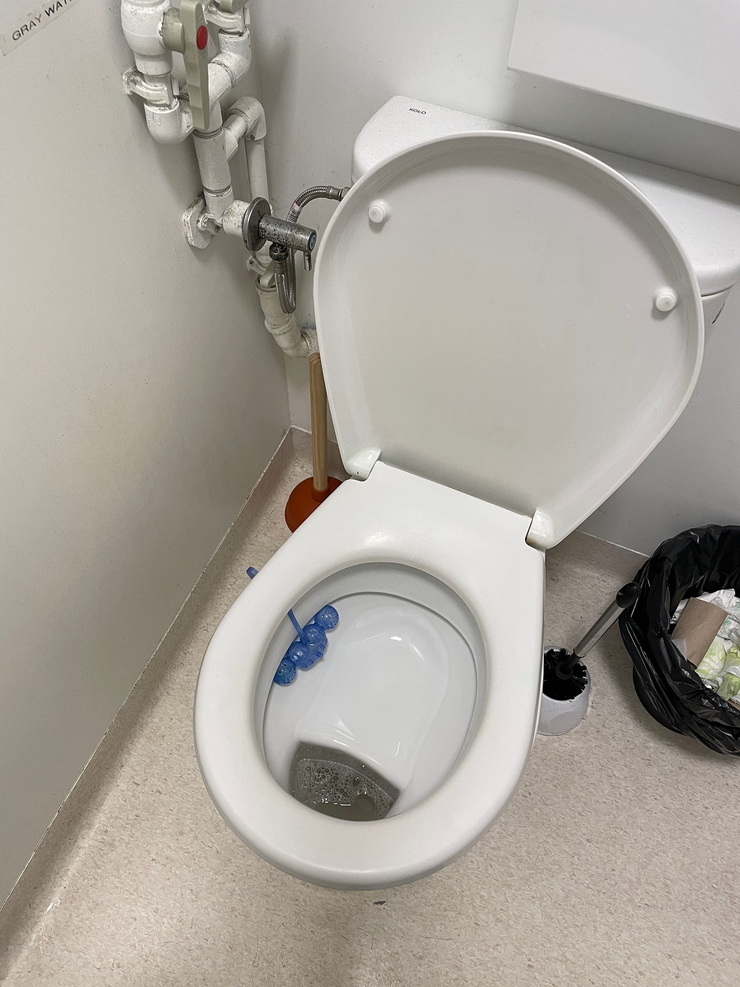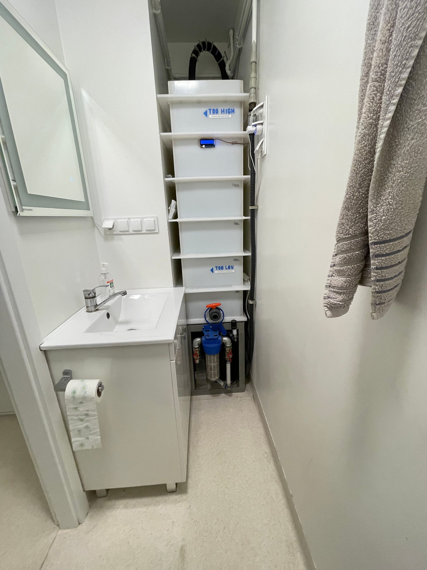 The habitat uses grey water recycling which services the shower, sinks, and toilet flushing. The waste water from the (single!) toilet is not recycled. Although the water is treated to drinking water standards, we were not able to drink it coming straight from the tap for insurance reasons. Instead, we used bottled water to drink directly, brush our teeth, and refill the kettle. We started the mission with a 2000 litre water tank of fresh water supplied by Ground Support (as the building is not attached to mains water) and carefully monitored grey water levels throughout the mission, switching between them as necessary.