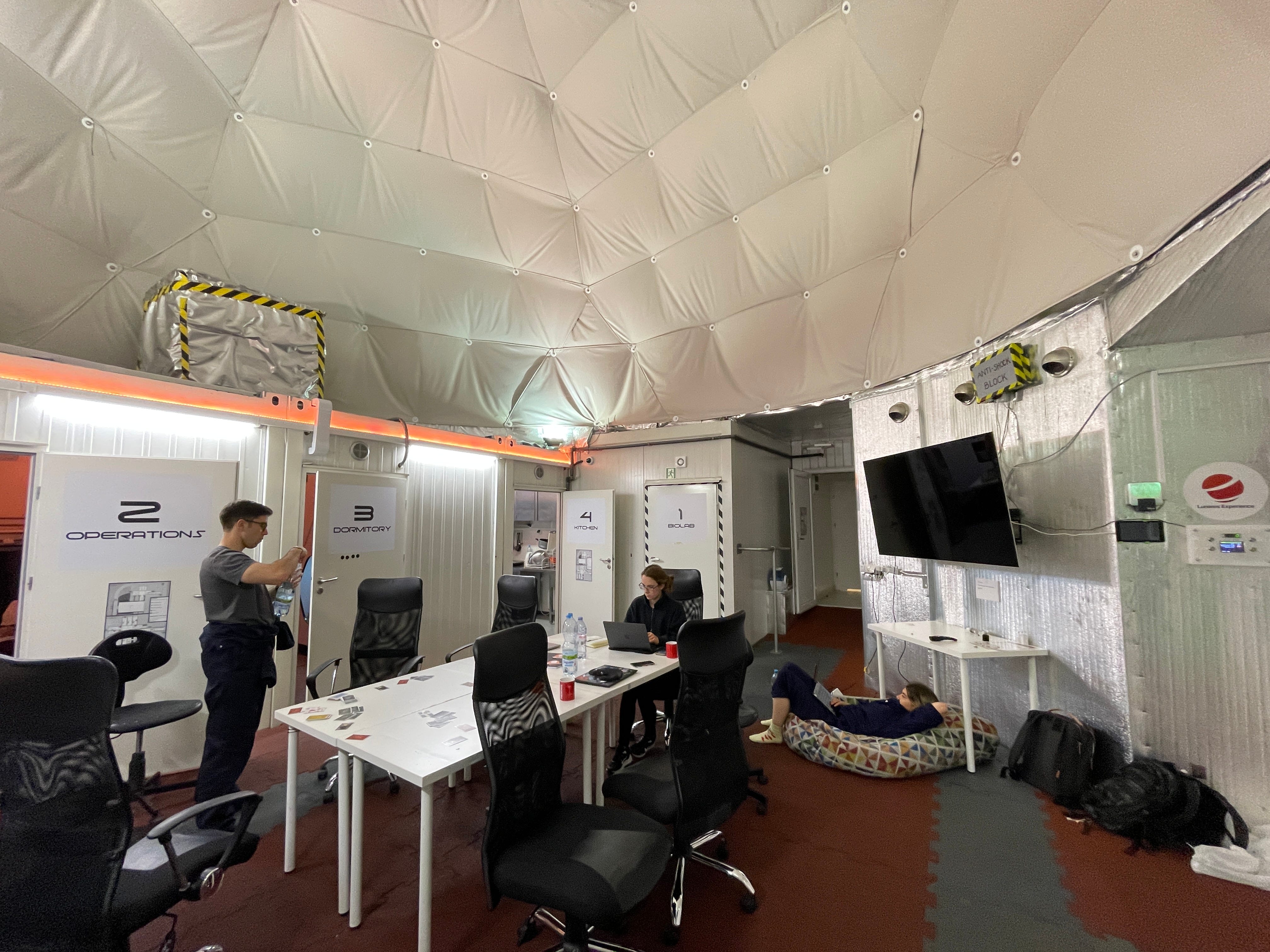 Every room apart from the sanitary module had a camera monitoring what the crew were doing. This was more for our safety and was not actively reviewed unless there was cause to. The footage is also not made available to researchers, even if they ask, to maintain crew privacy. In the dormitory, the camera greyed out the pod access hole so crew privacy whilst sleeping was preserved.