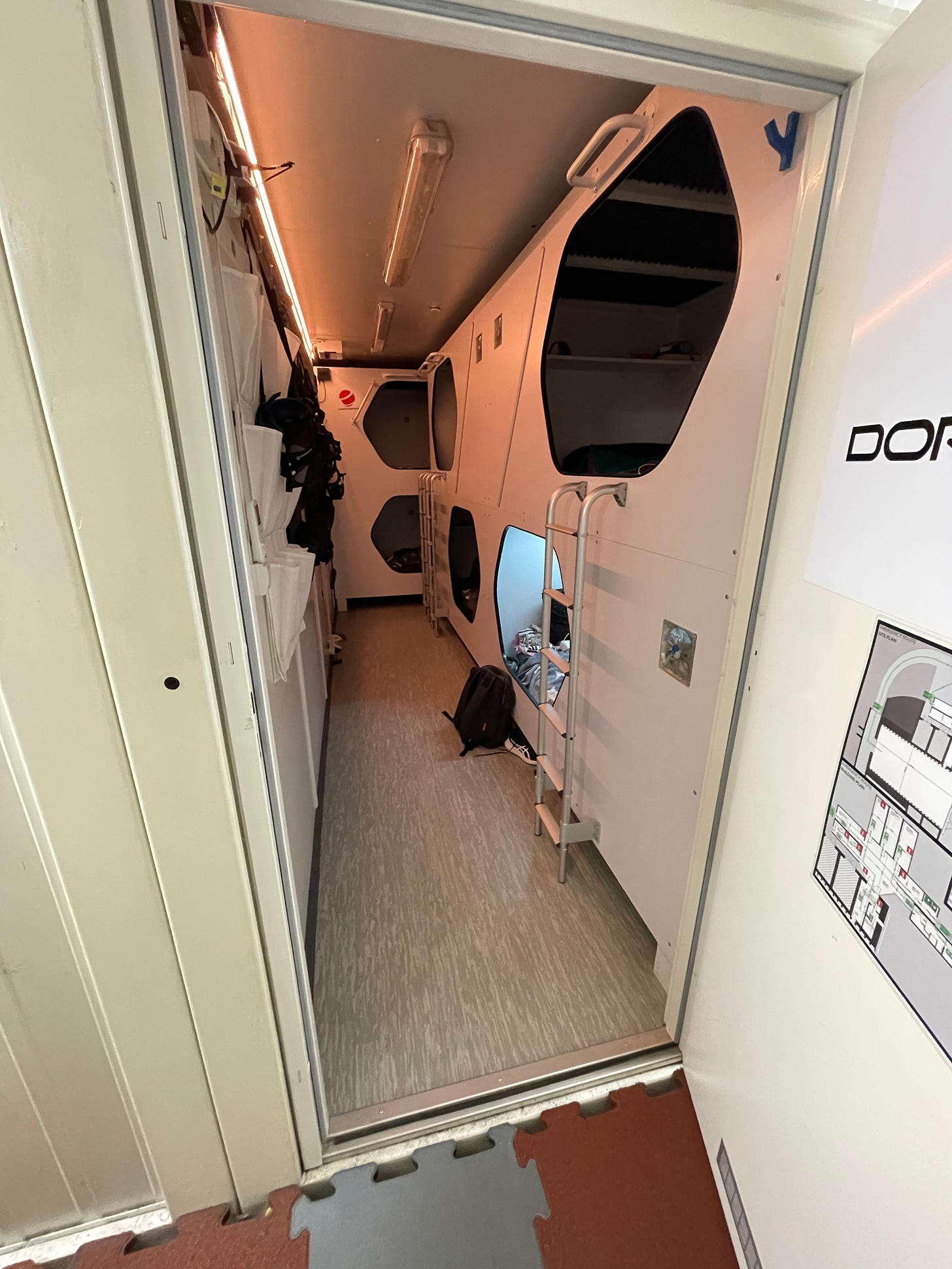 A dormitory that houses six sleeping pods