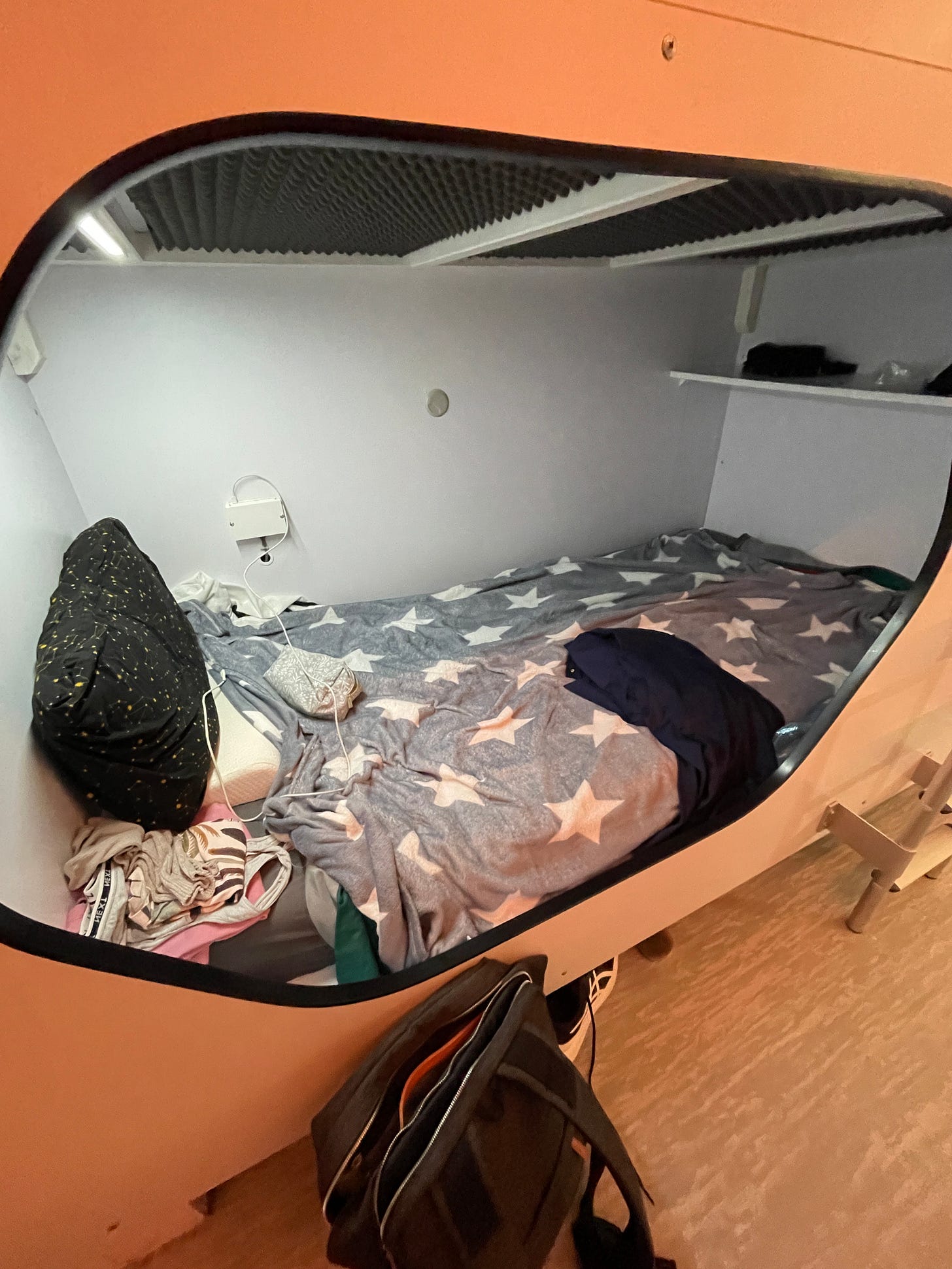 The dormitory contained six sleeping pods, which each had a mattress, sleeping bag, pillow and blanket. It was cosy but comfortable. The issue was that I’m a light sleeper, so during the night I often had to wear my Loops and a sleeping mask to block out the hab lights. Each pod had its own light, USB charging station, and shelf to put personal bits on.