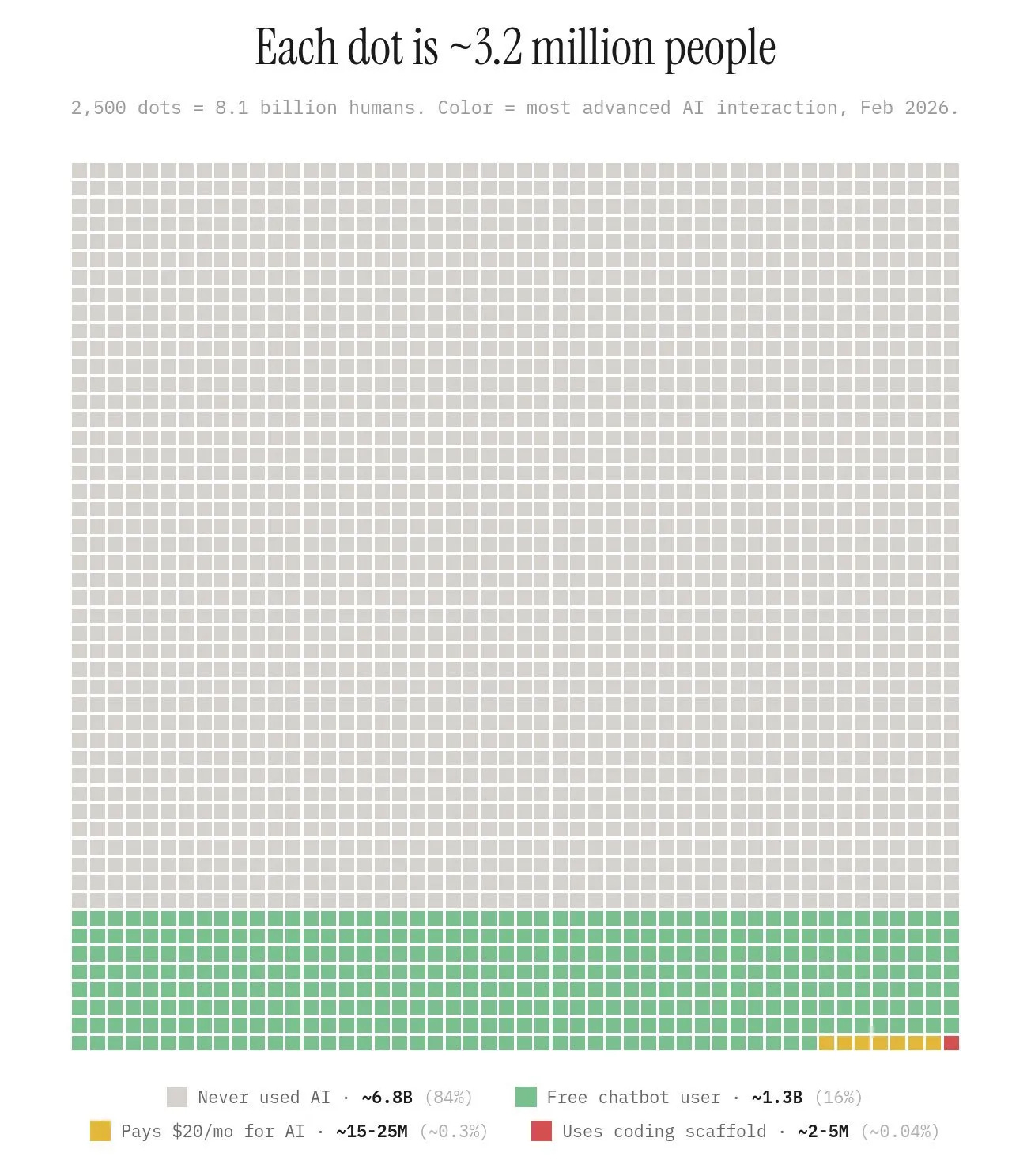 If you’re regularly using LLMs then you are amongst 16% of the global population. If you pay for it, you’re amongst 0.3%. And if you are coding with it, you’re in just 0.04% of the world’s total population.